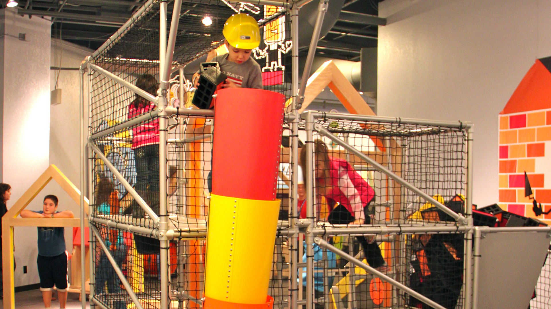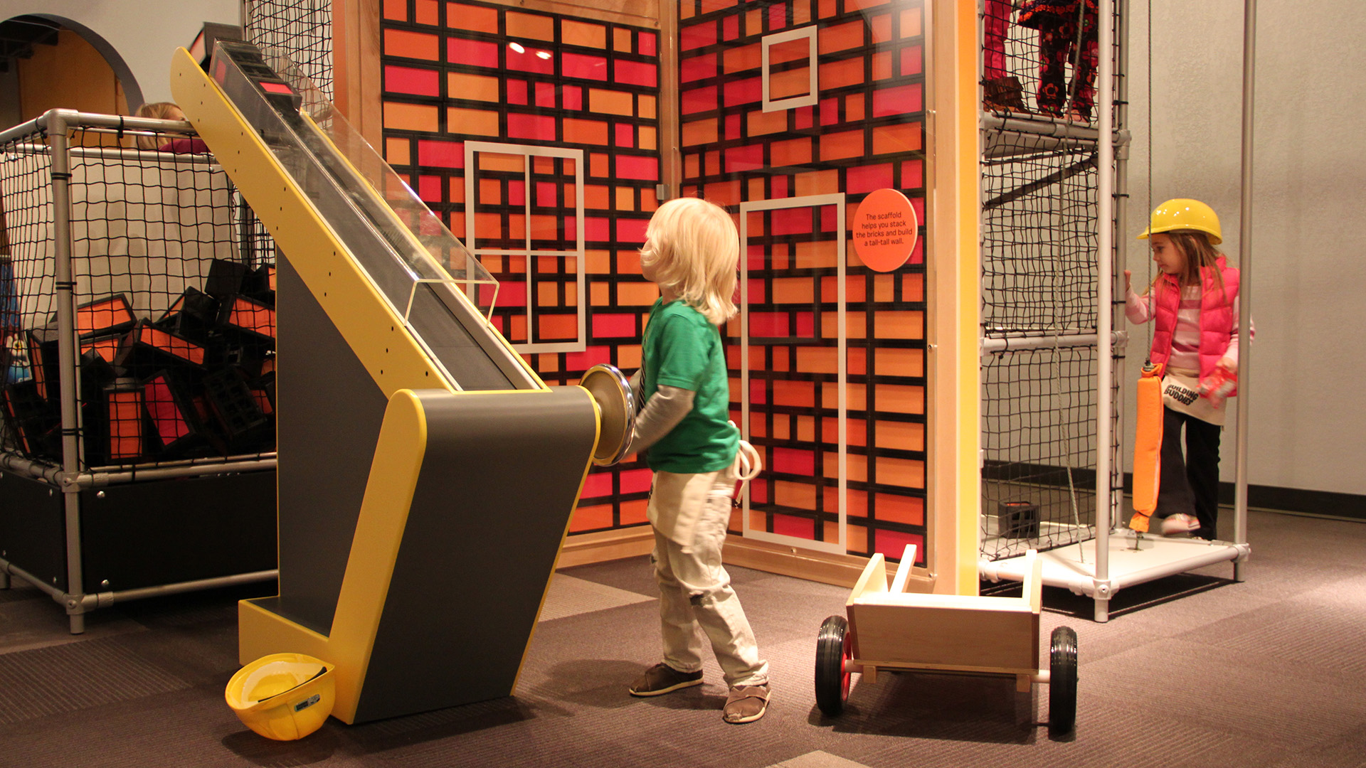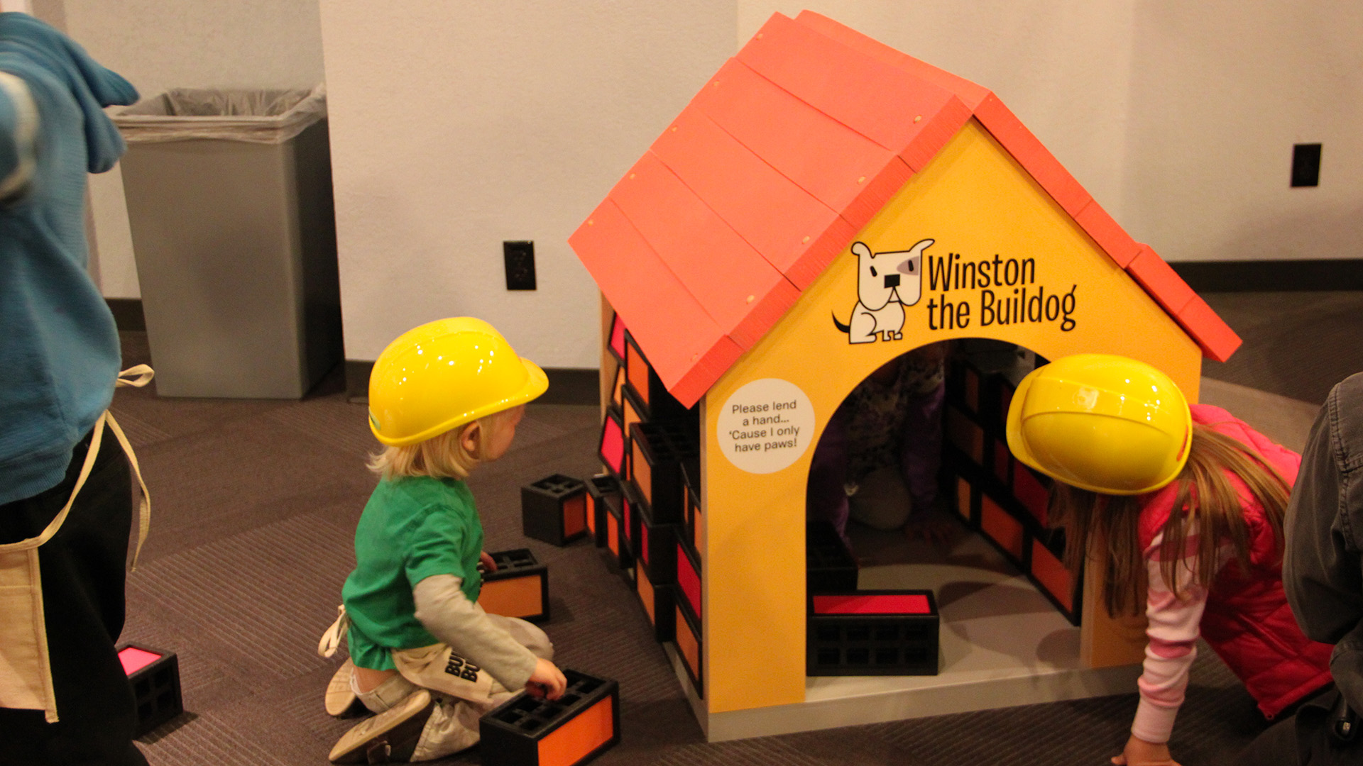 The Building Buddies exhibition portrays a small community where everyone is busy working on their homes. Different characters, “buddies”, invite young children to play, explore, collaborate, create, and learn while improving the “neighborhood.” Take a helmet and a safety vest to wear throughout the exhibition. Organize and plan a house with Peter the Architect. Help Eva to brighten up her bungalow. Build a dog house for Winston. Help Pipa Longpipe finish renovating her home. Climb up and build with Billy the Brick Layer. “Paint” with light, lay a garden path, climb a scaffolding, inspect a large drain pipe, build sturdy walls, and more!